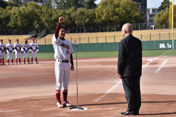 この日は試合に先立って開会式があり、山蔭主将が優勝旗を返還し、「一球一球集中し、正々堂々と戦うことを誓います」と宣誓。始球式のマウンドには本学硬式野球部の吉本亜紋マネジャー(経済学部3年)が登場し、盛んな拍手を浴びていました。