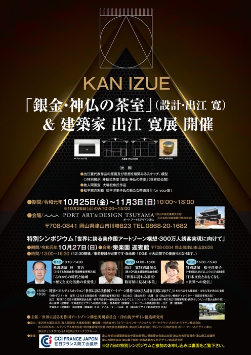 津山街デザイン創造研究所は、岡山県県北地域・旧美作国から、日本の伝統美から現代美を世界に発信し、年間300万人の誘客を目指す「美作国アートゾーン構想」の実現に向け、その活動の第一弾として、日本文化の茶の湯の精神の象徴である豊臣秀吉の「黄金の茶室」以来初の、建築芸術アートとなる新たな移動が可能な「銀金・神仏(かみほとけ)の茶室」を建築家・出江 寛氏が製作し、歴史的伝統のある津山の地で初公開します。また津山とゆかりのある金沢の漆芸家、人間国宝 故・大場 松魚氏の作品、そして水戸徳川家の末裔 松平 洋史子氏の新たな茶道具「I for you・宙」をあわせて展示する「出江 寛展」及び、日本を代表する建築家・文化人が津山に集結して特別シンポジウムを開催いたします。