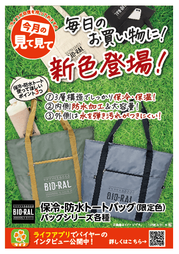 日々のお買い物からアウトドアまで、幅広いシーンでお使いいただけるBIO-RALの保冷・防水トートバッグは、ライフ313店舗のビオラルコーナーもしくは生活関連用品売り場にて販売しております。
