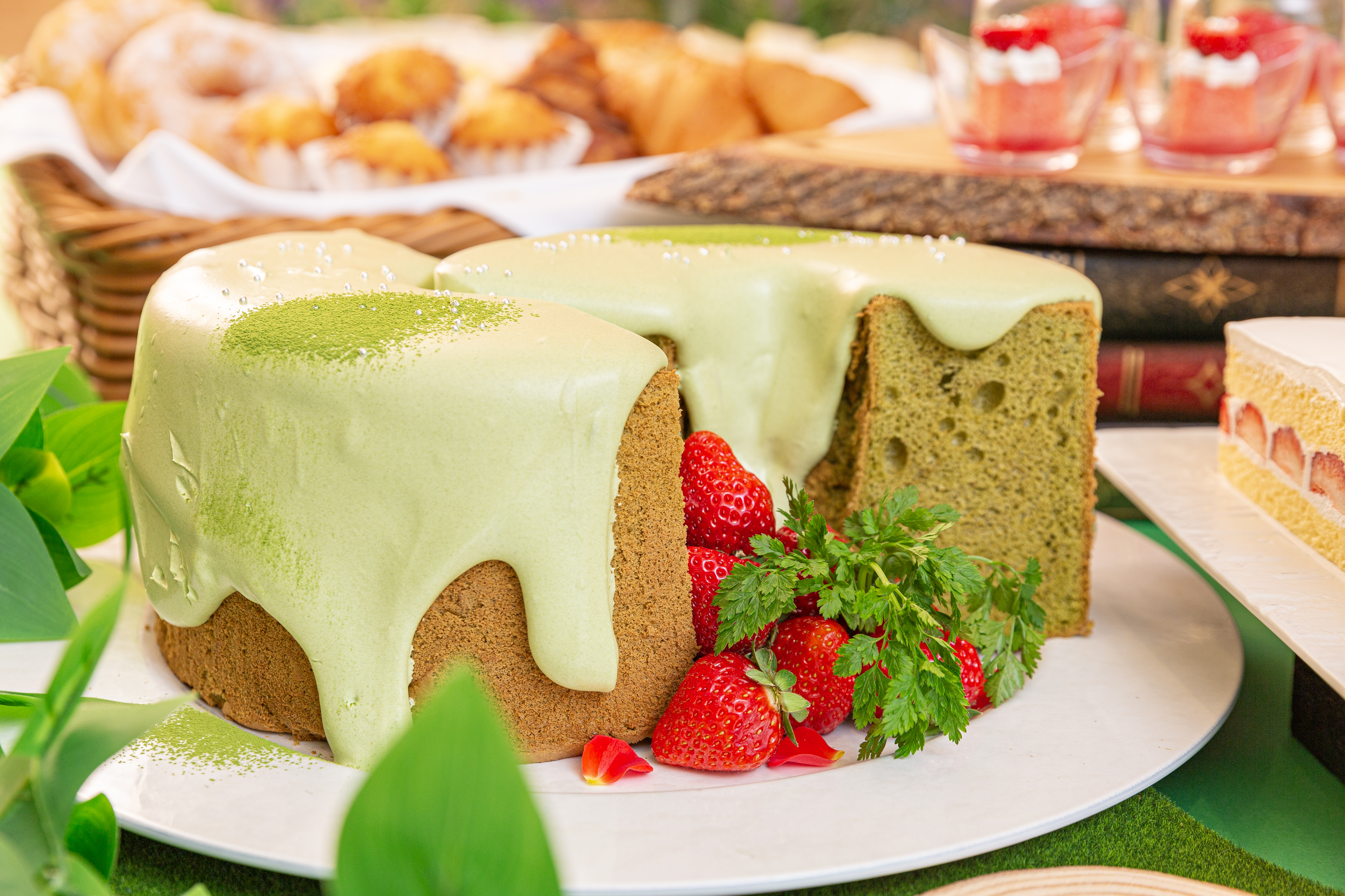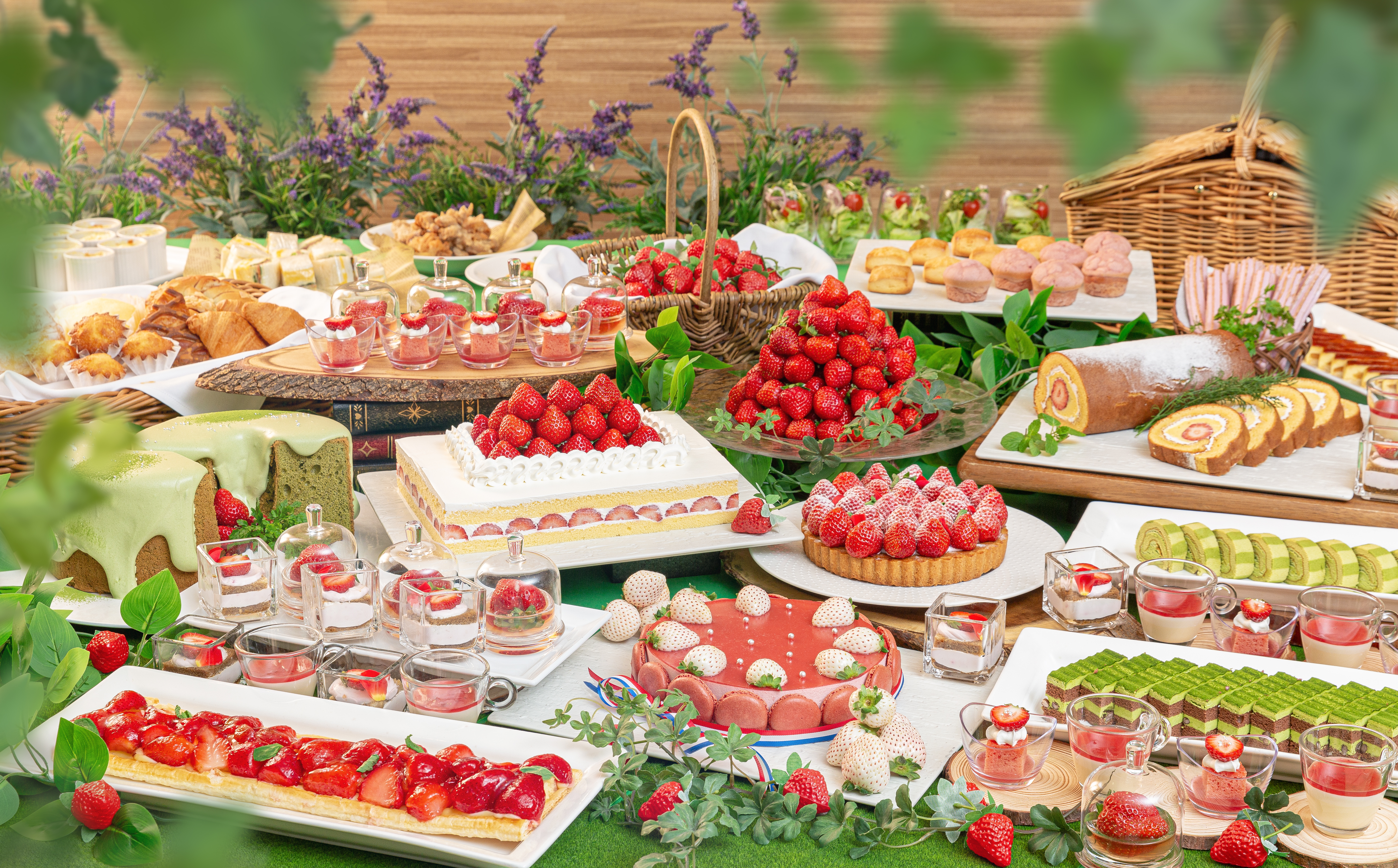 ビュッフェメニューには、当日入荷の3種の苺の食べ比べもお楽しみいただけるほか、苺の赤と抹茶の緑を使い、ガーデンをイメージしたスイーツをご用意しました。赤い苺ムースの上に白い苺のデコレーションが可愛い、天使のいちごとシャルロットをはじめ、苺のショートケーキ、苺ブラウニーや、苺のティラミス、苺ロールケーキなどいちごづくしのメニューから、抹茶のロールケーキやシフォンケーキ、ミルクレープなど抹茶の緑を使ったメニューを合わせてお楽しみいただけます。 またパスタやピザ、サラダ、サンドウィッチといった軽食メニューもご用意しておりますので、ご友人同士やご家族で開放感ある大きな窓からの景色、店内に施された春のガーデンをイメージした装飾の中、色鮮やかなスイーツとお食事で午後のひとときをお過ごしください。