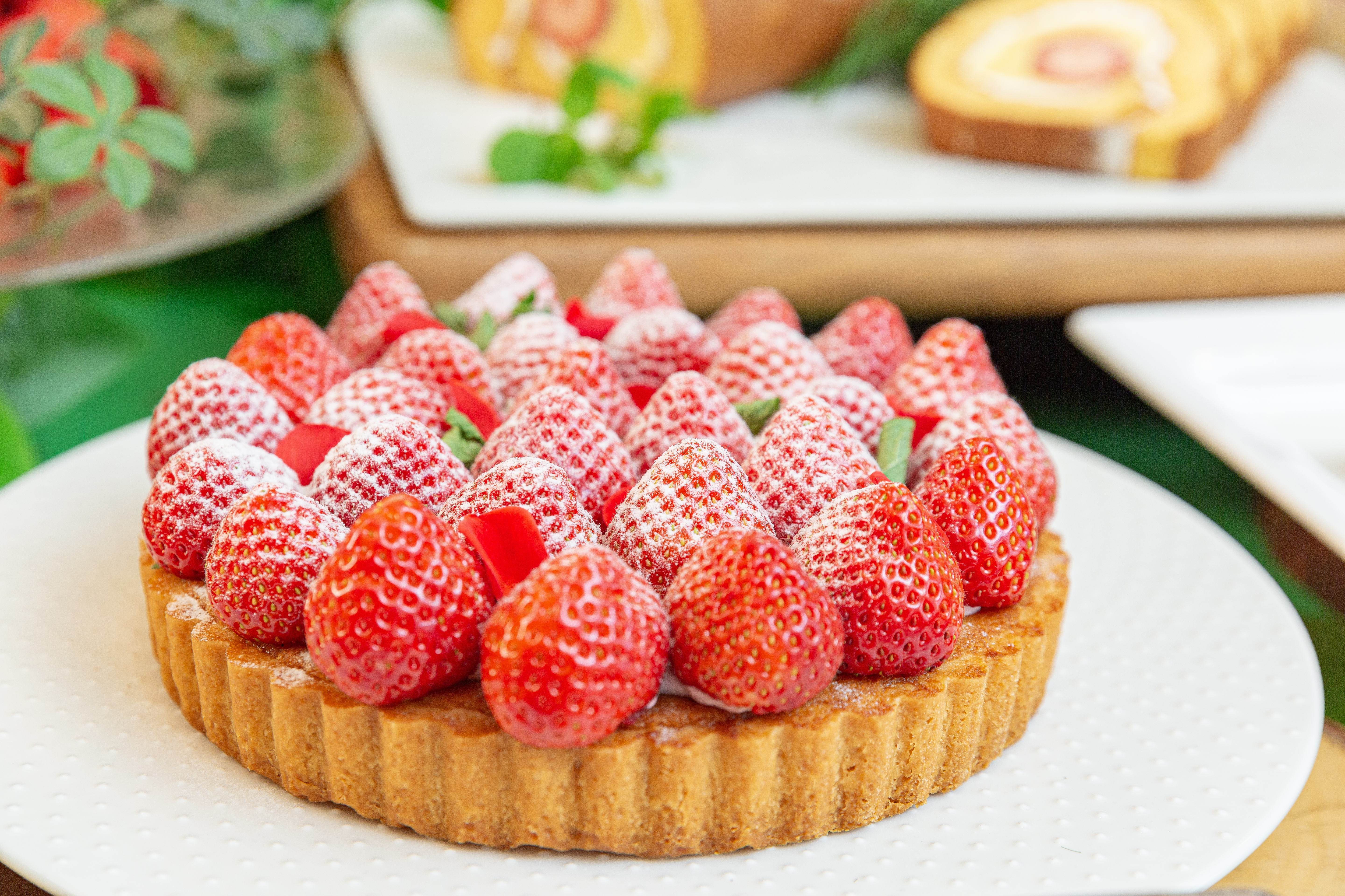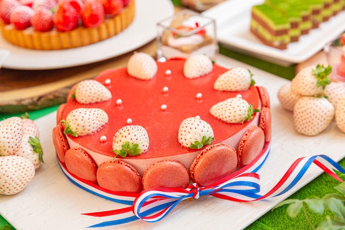 今年は、いちご、抹茶を使った20種以上のスイーツで、春のガーデンをイメージした色鮮やかなメニューをご用意しました。ビュッフェスタイルでお好きなだけお楽しみいただけます。また滋賀県の農園から直接届く“紅ほっぺ”、“章姫”、“ベリーポップすず”、“よつぼし”そして白い果皮の“天使のいちご”の5種類から1種をウェルカムスイーツとして通常サイズの約2倍の大きな苺をジュレにのせてお一人さま一皿ずつご提供いたします。