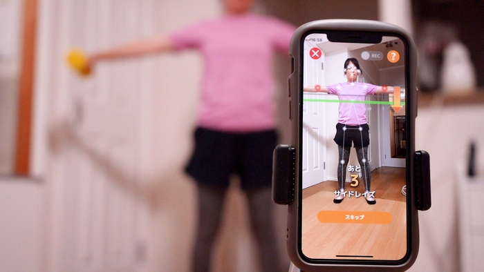 ▼「家トレ」利用の様子(サイドレイズ)※アウトカメラver.で撮影