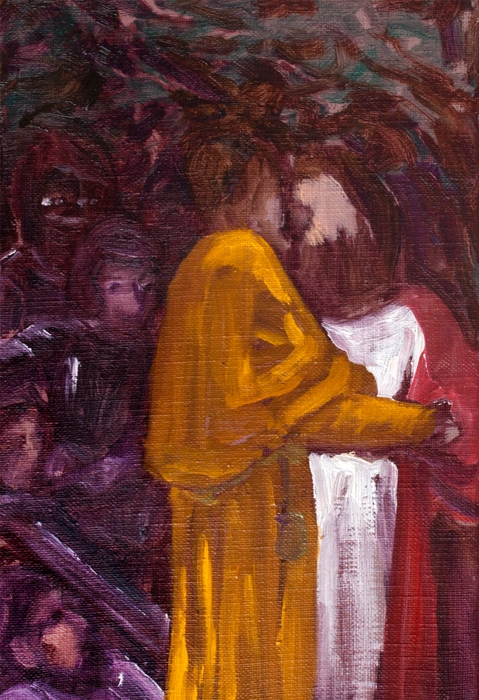 そのような劇的に断ぜられた場面を、ある作品では静粛に大きな筆で描き、ある作品では多彩で激しい筆触で塗り固める。このような大矢の筆触のあり方は、物語の登場人物の感情描写であると同時に、画家自身の感情表出となっています。