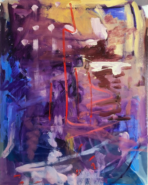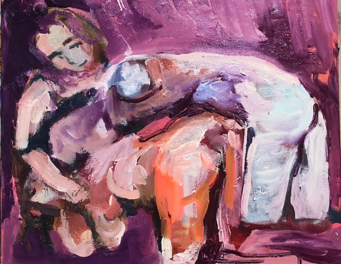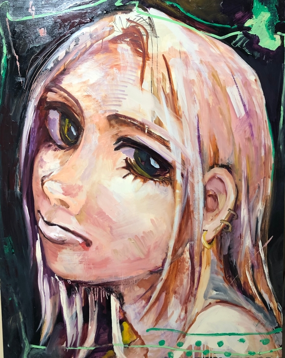 “大矢一穂の作品は、物語の瞬間を捉えるべく、絵具を滑らせていく”