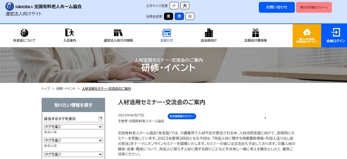 公益社団法人全国有料老人ホーム協会(理事長:中澤俊勝、所在地:東京都中央区)では、 介護業界で人材不足が懸念される中、人材活用支援に向けて、定期的にセミナーを実施【2023年度 開催予定日: 9/28・11/29・1/25・3/28】しています。