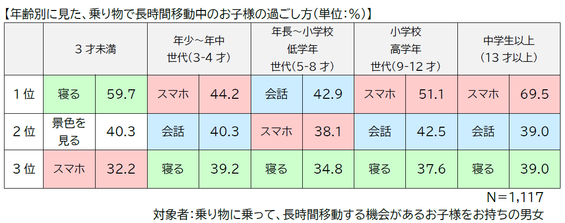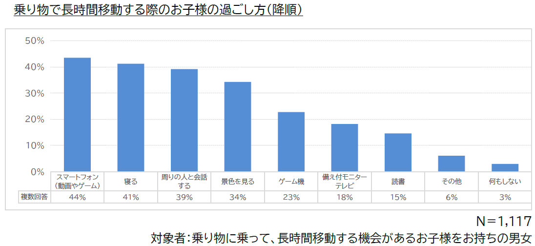 乗り物に乗って、長時間移動する機会があるお子様をお持ちの男女1,117名に、乗り物内でお子様がしていること・使っているものを調査しました。