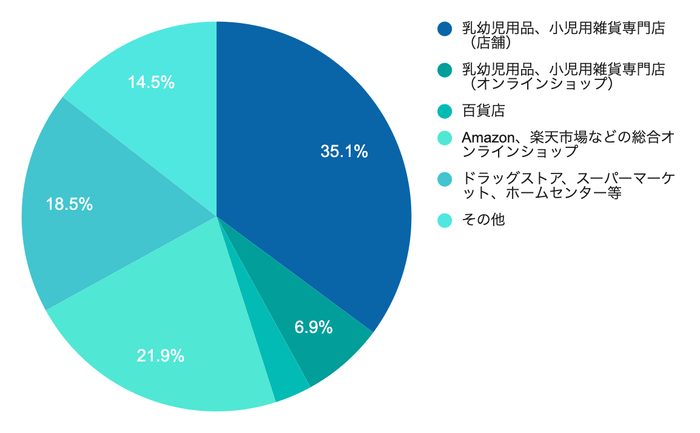 出産・育児関連用品については「乳幼児用品・小児用雑貨専門店の実店舗で購入する」という回答が最も多く、その次に総合オンラインショップが人気でした。