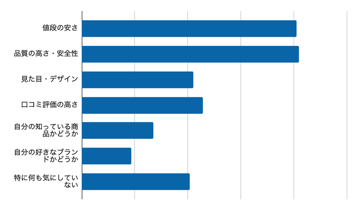 「品質の高さ・安全性」「値段の安さ」がほぼ同率1位という結果でした。品質重視であるのと同時に、出産・育児関連用品においても価格を重視していることが分かりました。
