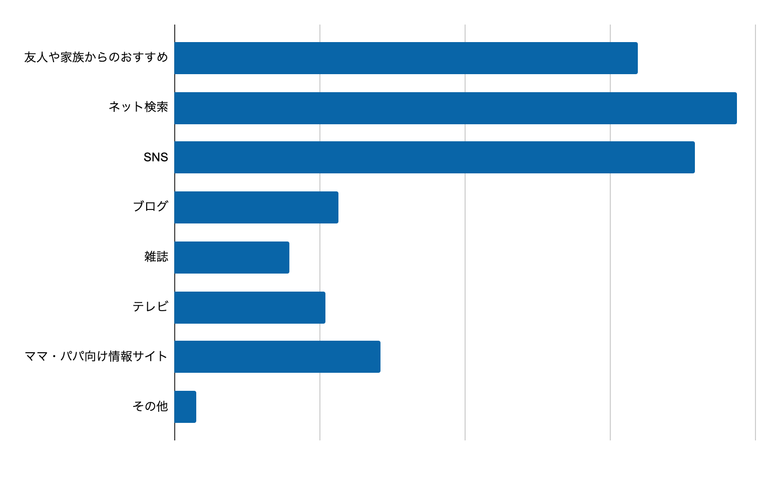 品質・価格の両方を重視する子育て世代は、「ネット検索」「SNS」「友人や家族からのおすすめ」を通じて出産・育児関連用品に関する情報を収集しているようです。