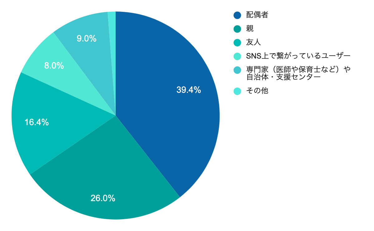 出産・育児に関する悩みの相談相手は「配偶者」という回答が最も多く、次いで「親」「友人」が多くみられました。子育て世代は、より身近にいる家族や友人に相談することの方が多いようです。「出産・子育て応援交付金事業」の一環として、各自治体は対象者に対して伴走型相談支援の拡充を目指しており、身近な家族や友人に加えて専門家により相談しやすい環境が整っていくことが期待できます。