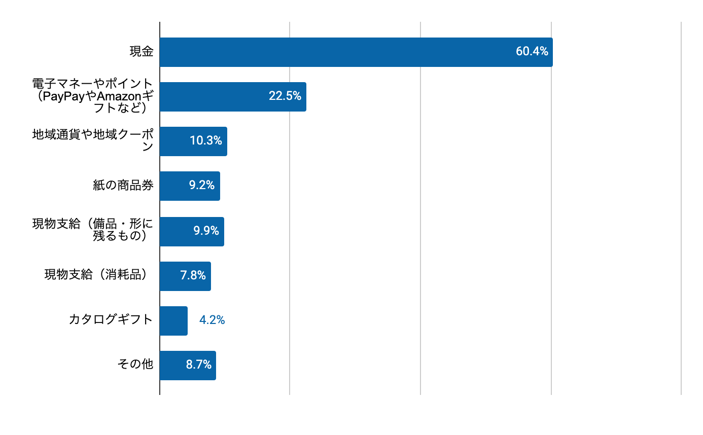 一方、上位の「現金」や「電子マネーやポイント」と比べると、「地域通貨」や「紙の商品券」など利用用途が限定されるものや「現物支給」はやや需要が低いことが分かりました。