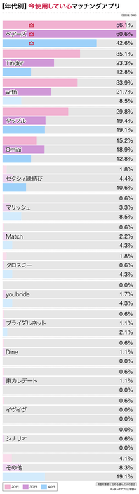 一方、40代は「ペアーズ」以外は2割を超えて使われているものはありませんでしたが、20~30代に比べて「ゼクシィ縁結び」(10.6%)、「マリッシュ」(8.5%)、「Match」(4.3%)、「youbride」(4.3%)といった婚活を目的としたアプリの利用が多くなっています。