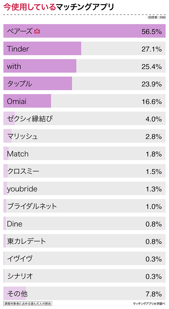 次は具体的に今使っているマッチングアプリの名前を聞いてみました。その結果、「ペアーズ」(56.5%)が過半数でダントツの1位に。2位からは「Tinder」「with」「タップル」「Omiai」と続き、さまざまなアプリの選択肢があるなかで、おおむね上位5つに人気が集まりました。