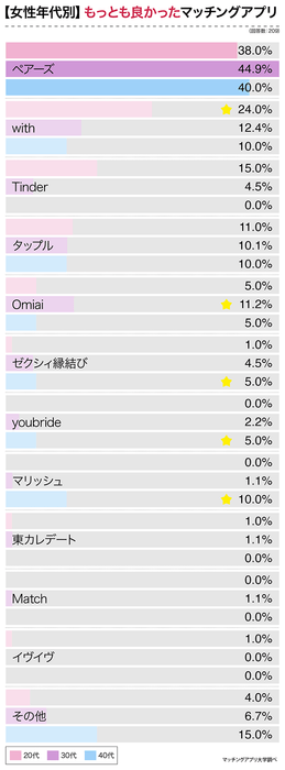 20代では「with」が24.0%とペアーズの次に人気で、30代・40代と比べて2倍以上の割合でした。30代では「Omiai」が11.2%と、他世代の2倍以上となっています。