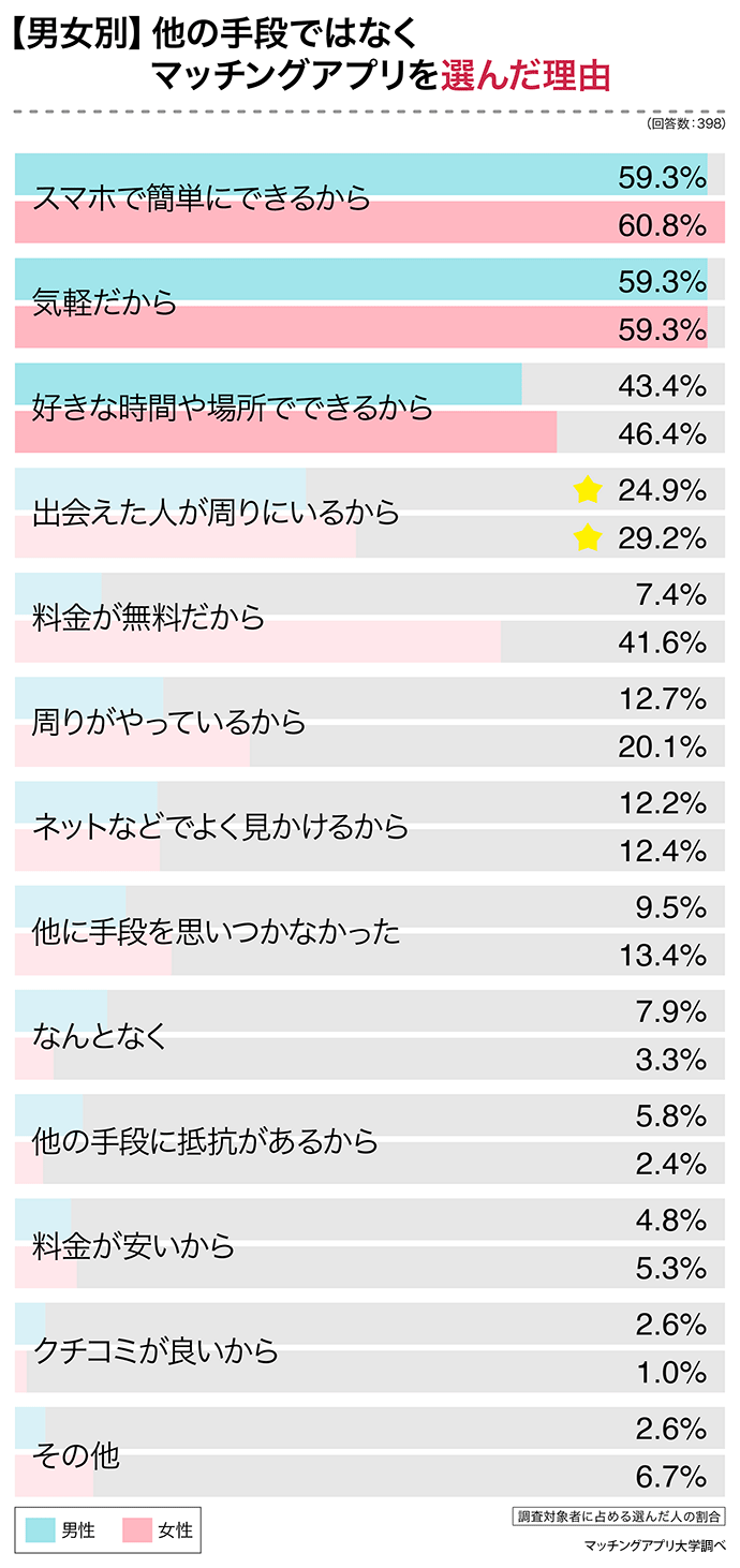 では、「なぜ他の手段ではなく、マッチングアプリを選んだのか」について聞いてみました。すると、男女ともに「スマホで簡単にできるから」「気軽だから」「好きな時間・好きな場所でできるから」が3トップとなり、いずれも50〜60%の人から支持されました。