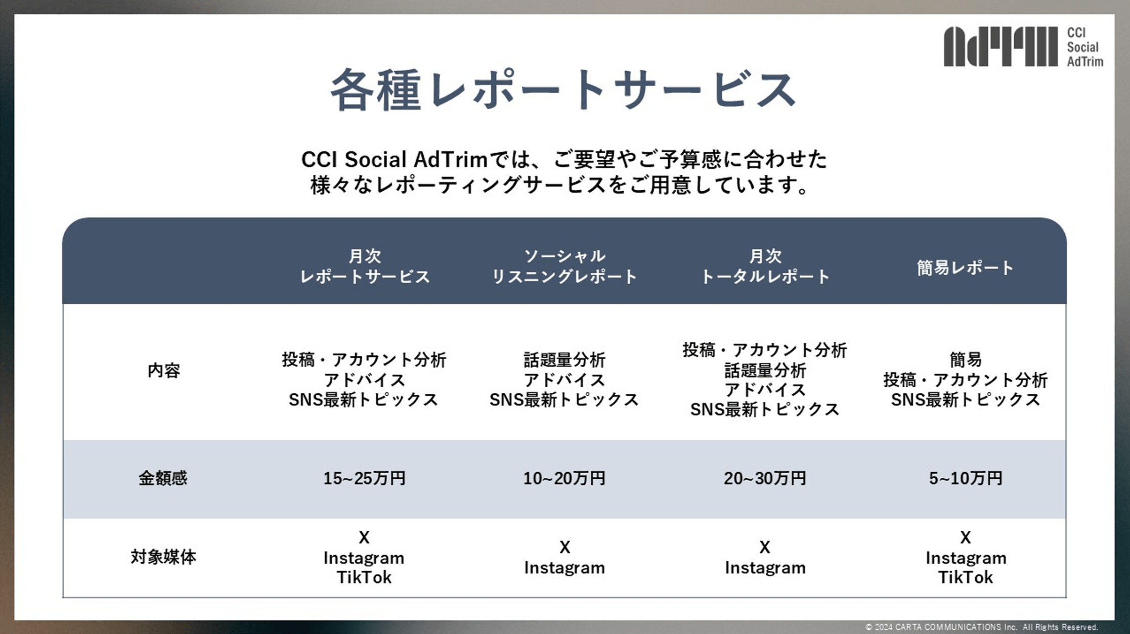 CCI Social AdTrimでは、自社開発SNS分析ツールで得られる定量的なデータを活用し、SNSコンサルタントがSNSアカウント運用における効果検証から改善提案をサポートいたします。ご要望やご予算感に合わせ「月次レポート」「ソーシャルリスニング」「月次トータルレポート」「簡易レポート」の4つのレポートサービスを用意しています。