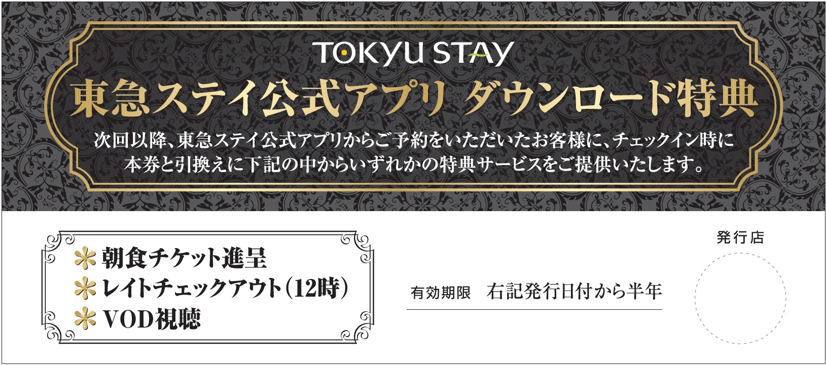 「東急ステイ 公式アプリ」の誕生を記念し、東急ステイ各店にて先着1万名様にアプリダウンロード特典をご用意いたしました。アプリをダウンロードして会員登録を行っていただき、フロントにてスタッフにホーム画面を見せていただいたお客様に、次回以降ご利用可能なクーポン券を進呈します。