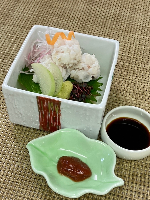 ◎鱧しゃぶ:ぷりっとした鱧をしゃぶしゃぶスタイルでお召し上がりいただきます。特製のポン酢でさっぱりとお楽しみください。