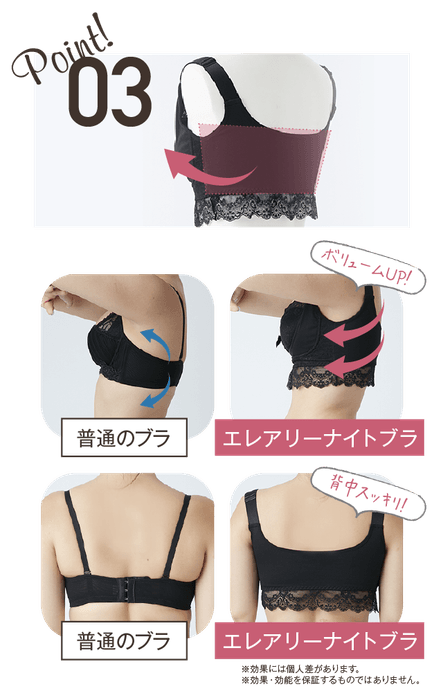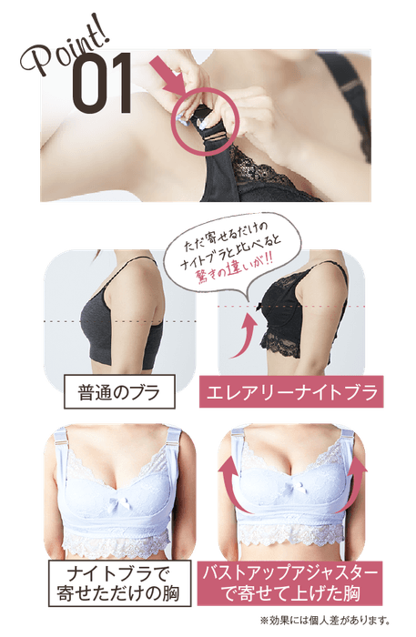 他のナイトブラにはないアジャスター付きでバストを寄せるだけでなくしっかり上げて、寝ている間も上向き美バストをキープできます。