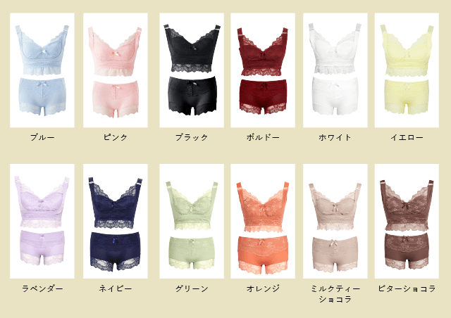 カラーはエレアリーナイトブラ&ショーツ共に全部で12色展開!