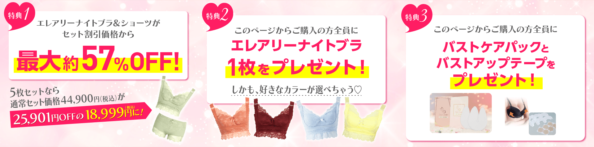 エレアリーナイトブラ&ナイトショーツのセットを5つご購入の方に、通常44,900円(税込)のところ、バストケアパック2つ、バストアップテープ、エレアリーナイトブラも1枚ついて約57%オフの18,999円(税込)(25,901円引き)にて提供します!