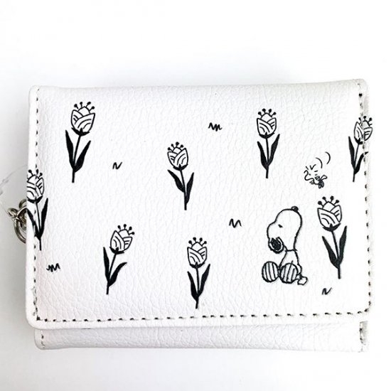 春らしいデザインのお財布も、ご紹介しちゃいます♪空を見上げるスヌーピーに、チューリップのデザインです。ホワイトのお財布って、オシャレですよね。