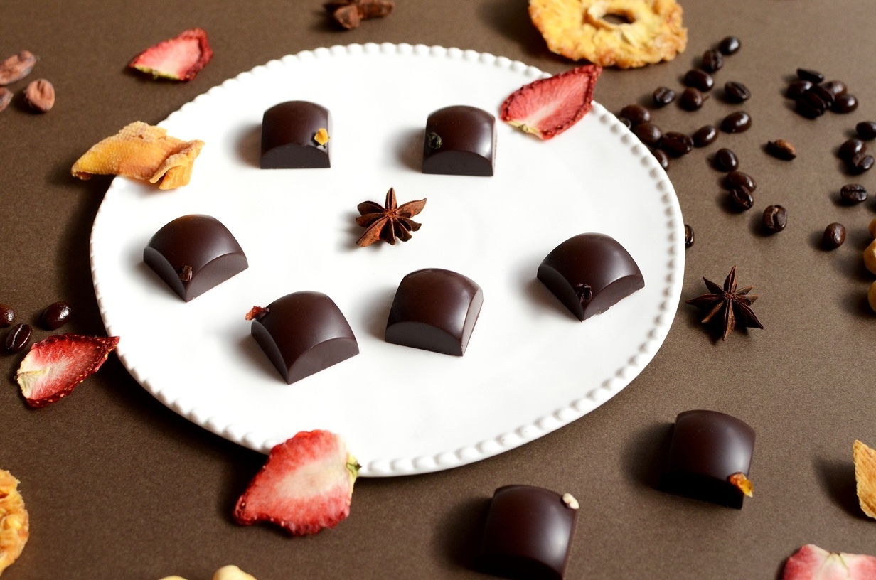 ボンボンショコラに一般的に用いられる合成色素や食品添加物を使用せずに、素材そのものを楽しむボンボンに仕上げました。原料にはすべて植物性の素材を使用しているため、ヴィーガンや食事制限のある方など、どなたにもお楽しみいただけます。フレーバーは、ベトナム素のままガナッシュ/八角カシス/ヘーゼルナッツプラリネ/マンゴーアールグレイ/ストロベリー/ジャスミンティーパイナップル/パッションフルーツ/カフェ。