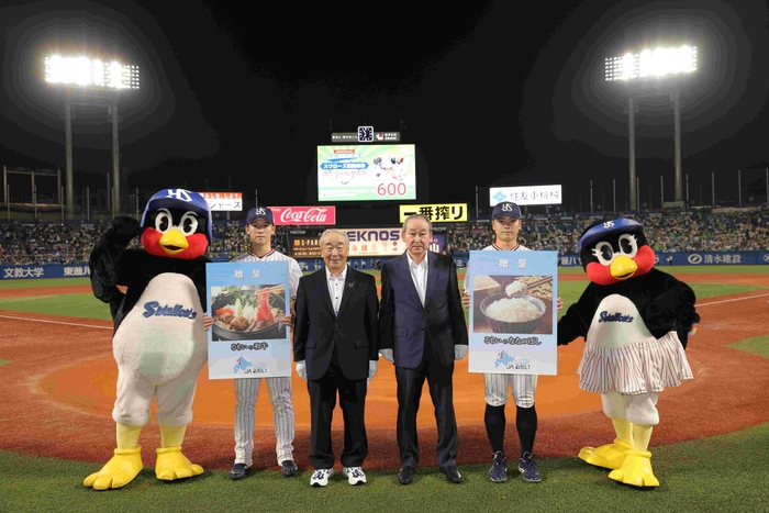 (3) ゲーム開始前、東京ヤクルトスワローズ選手に「JAるもい・ななつぼし」と「すき焼き用和牛」の贈呈式