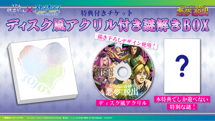 世界中で1,090万人以上を動員しているリアル脱出ゲームを企画運営する株式会社SCRAP(本社:東京都渋谷区、代表:加藤隆生)は、リアル脱出ゲーム×アニメ「ジョジョの奇妙な冒険 ストーンオーシャン」『ジョジョの奇妙な悪夢からの脱出』の描き下ろし新ビジュアルと、特典付きチケット「ディスク風アクリル付き謎解きBOX」の販売について発表いたします。