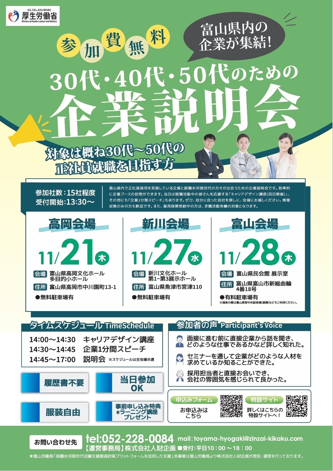 富山県内企業が集結!30代・40代・50代のための 企業説明会を2024年11月に3会場で開催