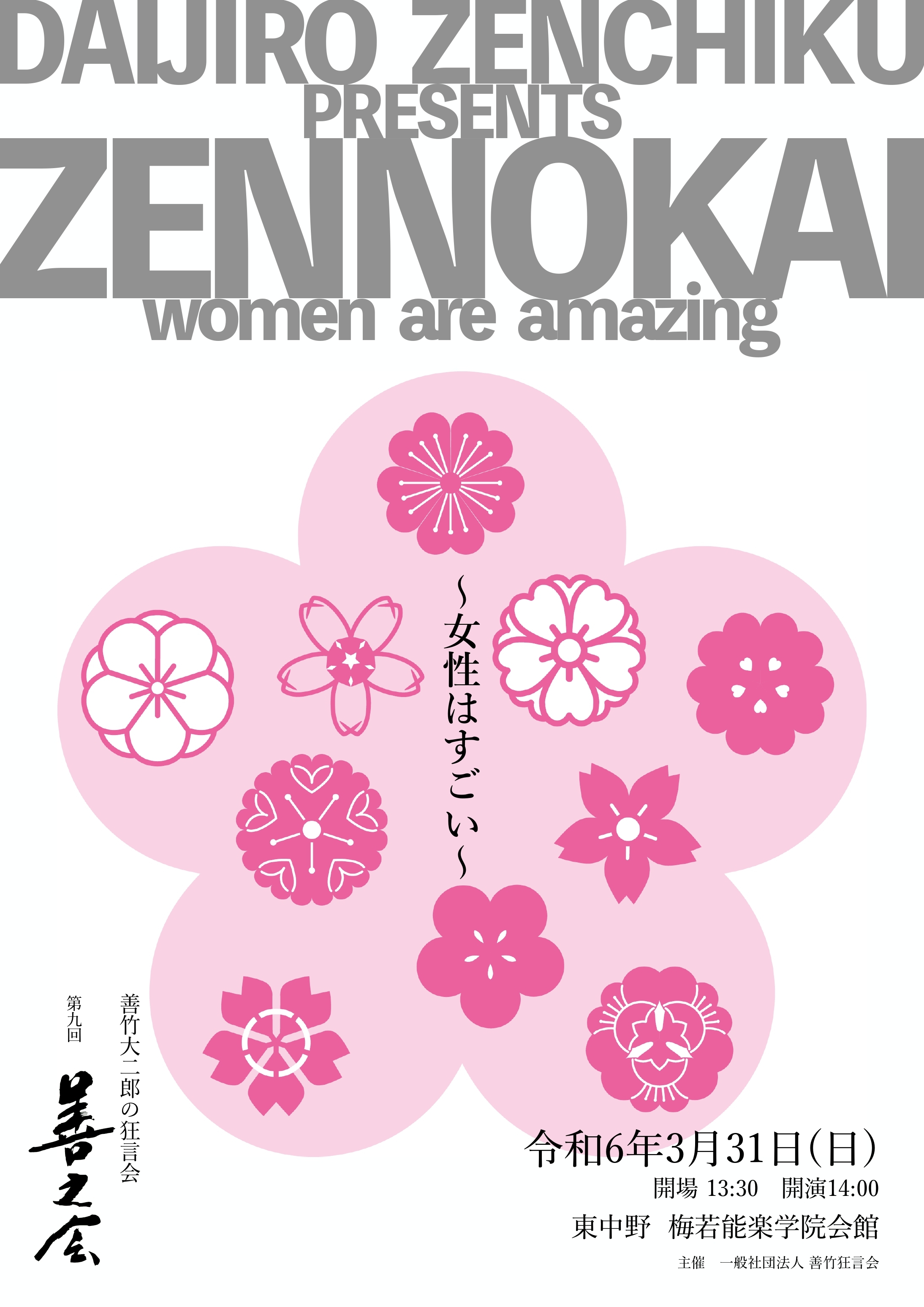 一般社団法人善竹狂言会主催、善竹大二郎の狂言会 『第九回 善之会 ~女性はすごい~』が、2024年3月31日(日)に梅若能楽学院会館(東京都中野区東中野2-6-14)にて上演されることが決定した。