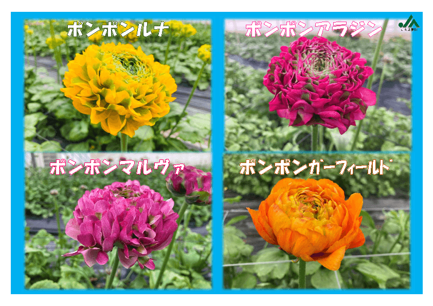 ラナンの紹介「ラナンキュラス(キンポウゲ科)」は、アルストロメリアやアネモネと並び、冬から春にかけて出荷される長野県の切り花の代表格であり、バラに似た花形や花色の豊富なことが特徴です。