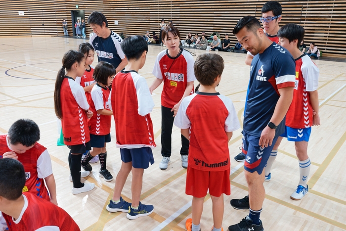 それをほぐしてくれたのが、ケルンのコーチによる交流型ウォーミングアップ。15名ずつが正方形の1辺になるように並び、合図と共に動き出し、真正面にいる人と足を合わせたり、ハイタッチをしたり。サッカースクールの責任者であるシャイベ・ジモンさんは、「合図を聞いて、周りの人にぶつからないように注意しながら動くので、色んなところに気持ちを向けながら行うウォーミングアップでした。『背の高い大人が子どもとハイタッチするときにどうするか』など、ちょっとしたことを考え、対応する。それに触れ合いがあるので、コミュニケーションが生まれます」と狙いを語りました。