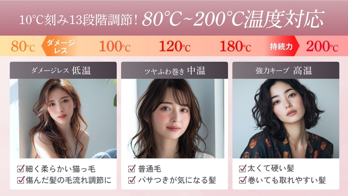 髪質やスタイルに合わせて、80℃〜200℃の13段階温度調節が可能。細く柔らかい髪から太く硬い髪まで、理想のカールを最適な温度で自在に楽しめます。また、毎日の使いやすさにもこだわり、熱くならない「掴めるグリップ」や滑り止めの「サポートシリコンライン」、ねじれを防ぐ「360°回転コード」など、細部まで快適さを追求。軽い力で扱える「押し込みやすいクリップ」設計により、ネイルをしていてもスムーズに操作でき、毎日のスタイリングをより美しく仕上げます。