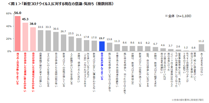 2番目に「自分が感染したら家族に移すのが怖い」、3番目に「自分が感染したら重症化するのが怖い」が挙がる。<図1>
