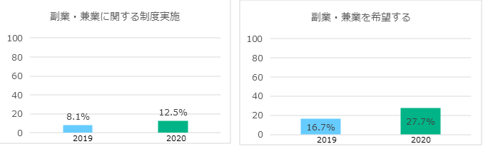 さまざまな雇用形態・業職種を対象とした調査によると、勤務先で「副業・兼業に関する制度導入」が実施されている人の割合は、昨年から4.4ポイント増加し、今年は12.5%。また正社員のうち、副業・兼業を希望する人の割合は、昨年から11ポイント増加して今年は27.7%と副業・兼業についての注目が高まっています。