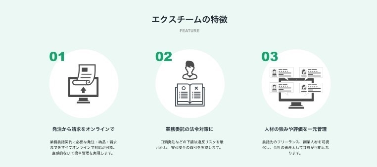 「オンラインでの取引」「案件履歴の保存」「案件進捗管理」「請求管理」「人材のスキル、強み管理」「エージェント管理」「法律への対応」など、エクスチームでできることを、実際の画面イメージとともにご紹介しています。