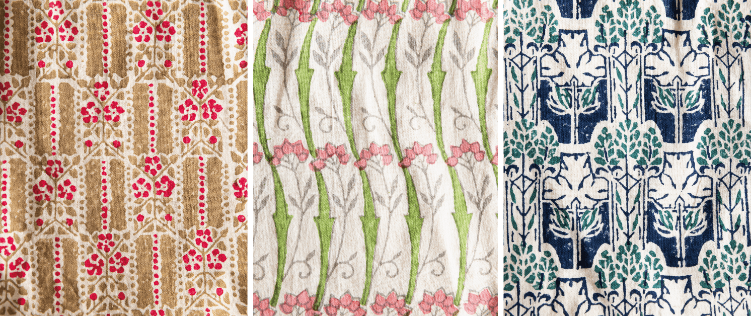 同じコレット柄をブロックプリントによって再現されたアイテムも、同時に販売します。同じデザインソースでありながら、技法によって表情が異なるのも手仕事によるコラボレーションの魅力の1つです。インドの職人により、新たに手彫りしたブロックを使ってハンドプリントされています。