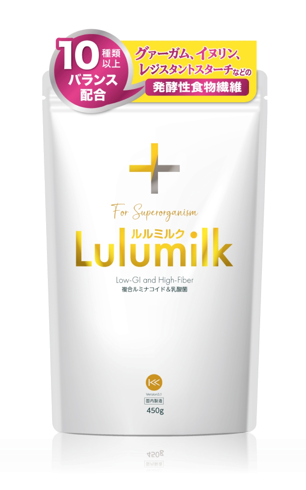 ルルミルクは、常在菌との共生を考えて開発した、“超生命体”のための栄養補助食品です。腸内での発酵スピードや特性が異なる多種類の発酵性食物繊維(ルミナコイド)をバランス良く配合し、毎日手軽に、飽きずに継続摂取できるよう工夫をしています。(ルルミルク・バージョン3では10種類以上、バージョン4では20種類以上を複合)