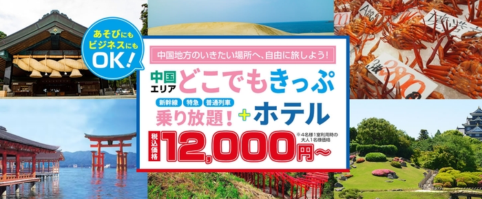 【2日間12,000円~】中国エリアどこでもきっぷを使って 山陽・山陰の行きたい場所へ自由に旅しよう!!お得なホテルがセットになったツアーです。