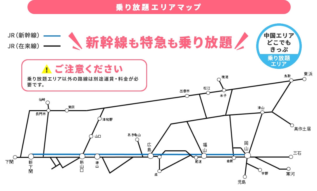 中国エリア自由周遊区間内のJR西日本線(新幹線・特急を含む)の普通車自由席が乗り放題です。