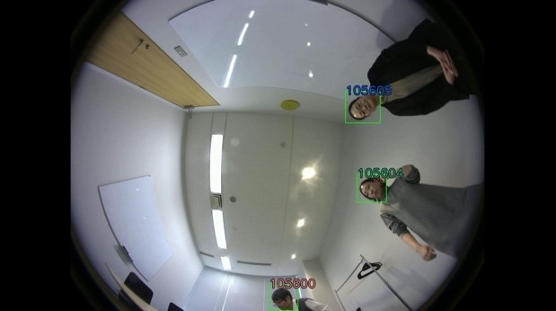 下記画像は、FaceMe を搭載したLOVOTから見える画像です。画像内の顔の横の数字は、個人を識別した時の番号です。左画像のように正面を向いている時に特定した個人の番号が、右画像のようにLOVOTの方を向いていない画像でも同様に振られており、LOVOTが3人それぞれを識別している様子がわかります。