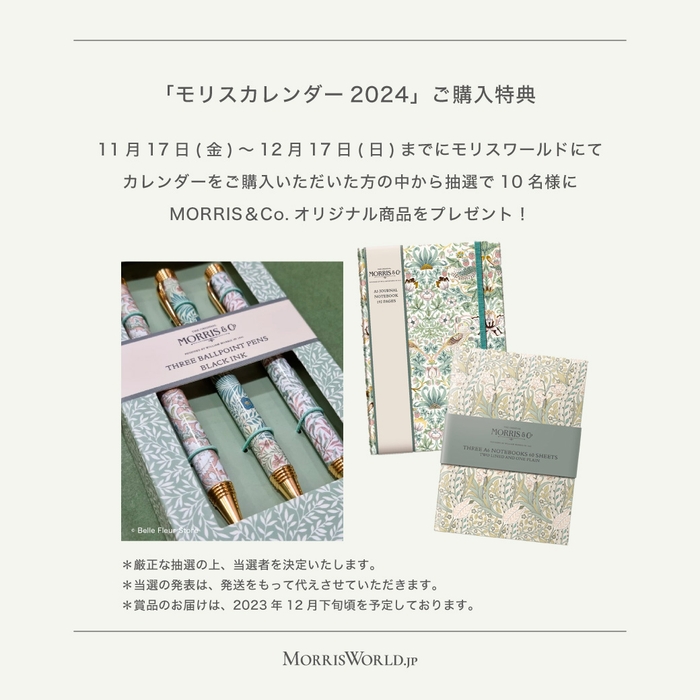 12 月17 日(日)までにMORRISWORLD.jpにて「モリスカレンダー2024」をご購入いただいた方の中から、抽選で10名様にMORRIS&Co.オリジナル商品をプレゼント!