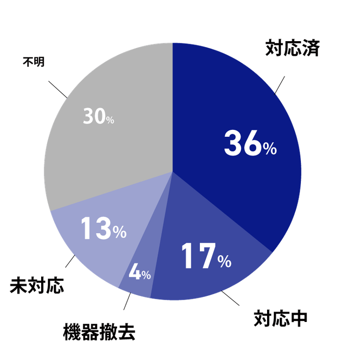 今回の注意喚起連絡時点では、12%の企業は脆弱性対応のためのバージョンアップの必要性を認識していない状態でしたが、58%の企業は必要性を認識しており、すでに対応済みか順次対応中でした。
