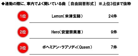 全回答者(1,000名)に、通勤の際に、車内でよく聞いている曲を質問したことろ、1位は「Lemon(米津玄師)」、2位は「Hero(安室奈美恵)」、3位は「ボヘミアン・ラプソディ(Queen)」となりました。