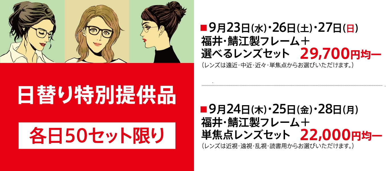 明治20年創業、今年で133年の歴史を持つ眼鏡店・株式会社金鳳堂(東京都港区、代表取締役社長:恒吉裕司)は、9月23日(水)~28日(月) 立川髙島屋S.C.3階 イベントスペースにてメガネ・サングラスバーゲンを開催します。メガネ職人こだわりの福井・鯖江メイド・イン・ジャパンフレームレンズセットや、有名ブランドのフレームレンズセット、サングラスをお買得価格にて豊富に取り揃えました。