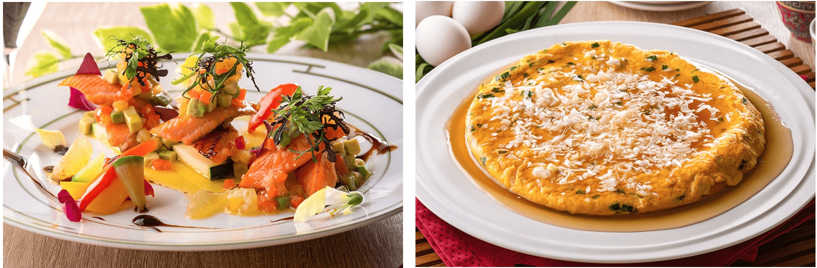左:天然素材にこだわったオリジナルな餌で育てられた大滝日光サーモンをポワレでお楽しみください。皮はパリっと、身はふっくらと焼き上げて彩り豊かな野菜と一緒にご提供いたします。