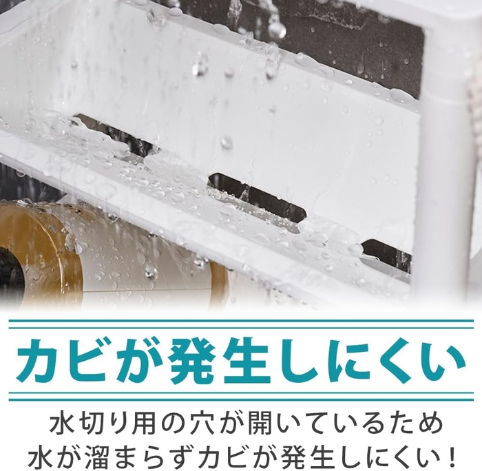本体は軽量かつ耐久性に優れたプラスチックを採用しており、水に濡れても錆びたり劣化しにくいためバスルームでも気兼ねなくお使いいただけます。各収納ポケットの底部には水切り穴が開いているのも嬉しいポイント。上からお湯を被っても自然と排水されるため、水が溜まらずヌメリやカビの発生を抑える役割を果たします。