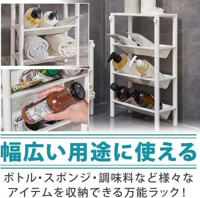 収納ポケット3段に加えて、天板にも物を置ける実用的なデザインで使い勝手にもこだわっています。V字により自然と傾斜が生まれるため、ボトルや瓶などの縦長アイテムもラクラク収納できちゃいます!バスルームだけでなく、キッチン・トイレ・リビング・子供部屋など様々な場所で使用可能。工具を使わずに組み立てられるので、DIYが苦手な方でもチャレンジしやすい収納グッズです。