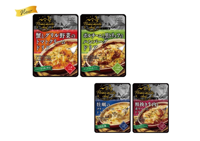 ほぐし蟹とアメリケーヌソースの旨味が溶け込んだ濃厚なトマトクリームソースにイタリア産グリル野菜を加えた「蟹とグリル野菜のトマトクリームドリア」、食べ応えのあるハンバーグとデミグラス風味のソースにポルチーニと黒トリュフを溶け込ませた「ポルチーニと黒トリュフのハンバーグドリア」で、手軽に、いつもより贅沢な味をご家庭で楽しんでいただけるドリアソースです。